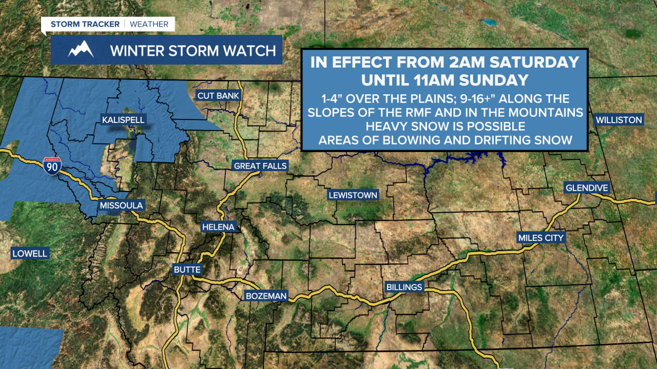 A Winter Storm Watch is in effect for western Glacier County and western Pondera County from 2am Saturday until 11am Sunday. 1 to 4 inches of snow accumulation is expected in the plains, while 9 to 16+ inches of snow accumulation is expected along the slopes of the Rocky Mountain Front and in the mountains. Some of this snow may be heavy at times. There are also going to be areas of blowing and drifting snow around.