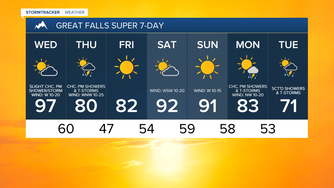 For tomorrow, we are going to have partly cloudy skies with some scattered showers and thunderstorms around during the afternoon and evening in locations east of I-15 in north-central Montana and around the Helena area. A couple of these thunderstorms may be severe with damaging winds (58+ mph). It is also going to be hot again tomorrow as highs are going to range from the mid 80s to the low 100s, with the coolest temperatures along the Rocky Mountain Front and the hottest temperatures in northeastern Montana.