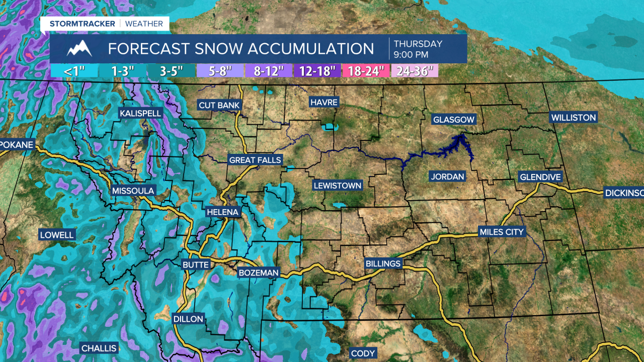Through Thursday evening, most of the snow accumulation will be along and west of the Continental Divide, with some of the peaks possibly receiving up to a foot of snow. East of the Continental Divide, a coating to a couple inches of snow is possible in the mountains. In the lower elevations, little to no snow accumulation is expected. This snow will cause some of the mountain passes in western and southwestern Montana to be slippery at times, so please use caution when driving.