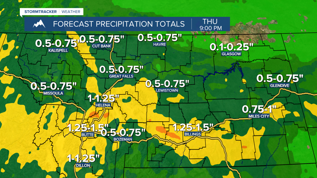 Between Monday evening and Thursday evening, a lot of locations in Montana will receive between .5” and 1.5” of precipitation, with the highest precipitation amounts expected in southwestern, south-central, and central Montana. In north-central Montana, precipitation amounts will get lower the further east you go, with less than a quarter inch of precipitation expected in northeastern Montana. Also, the bulk of this precipitation will fall on Wednesday and Thursday.