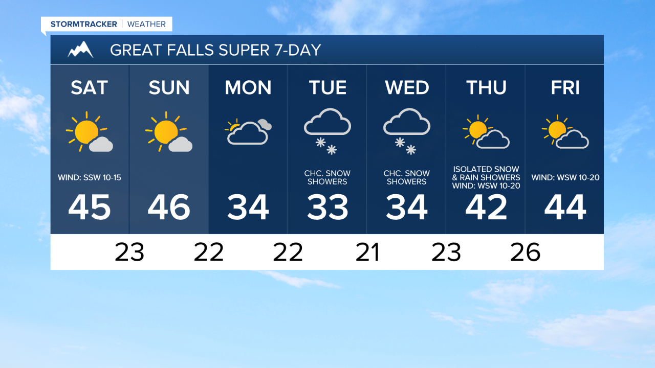 We are then going to have a chance to see some snow showers on Tuesday, Wednesday, and Thursday, especially around the Helena area, as a few disturbances pass through our area. Some rain showers are also possible on these three days in some of the lower elevations in central Montana. There is still a lot of uncertainty with the models regarding the precipitation next week, so stay tuned for updates as we get closer. We are also going to have mostly cloudy skies on Tuesday and Wednesday and partly cloudy skies on Thursday.