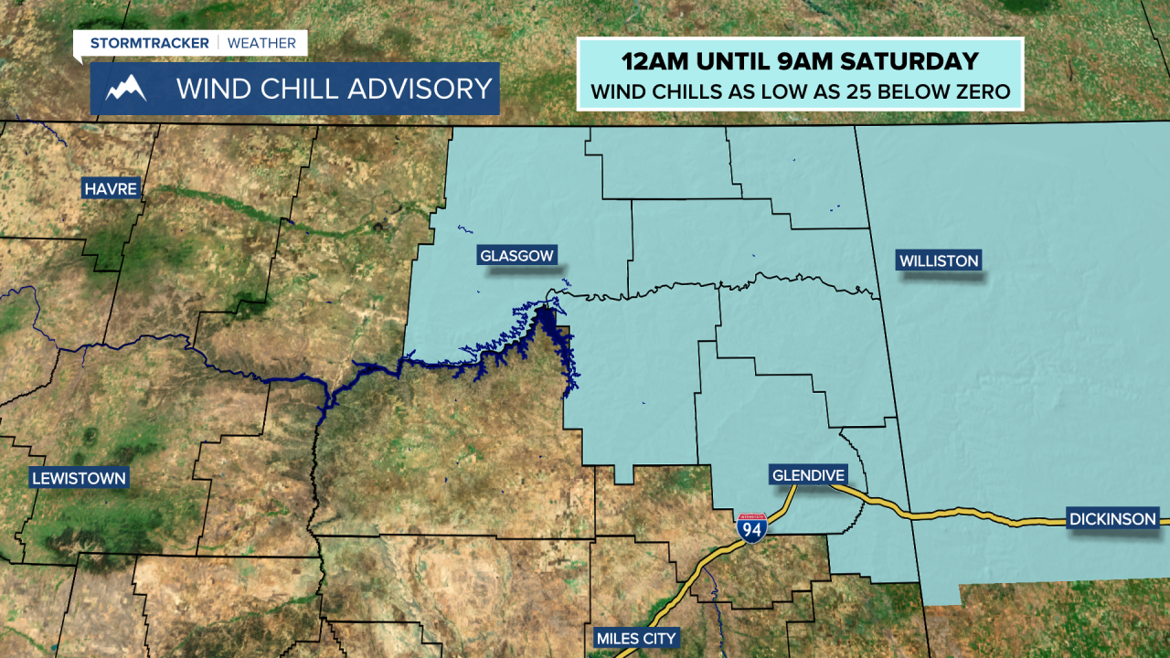 A WIND CHILL ADVISORY is in effect from 12am until 9am Saturday for northeastern Montana. Wind chills as low as 25 below zero are possible.