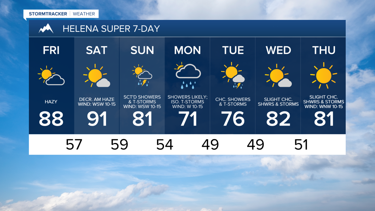 Mostly sunny skies and mostly dry conditions (just a slight chance of showers and thunderstorms around the Helena area) are then expected on Wednesday and Thursday as high pressure is going to be in control of our weather. It is also going to be mild/warm on these two days as highs are going to be in the 70s and low to mid 80s. There is also going to be a bit of a breeze around on these two days as sustained wind speeds are going to be between 5 and 20 mph.