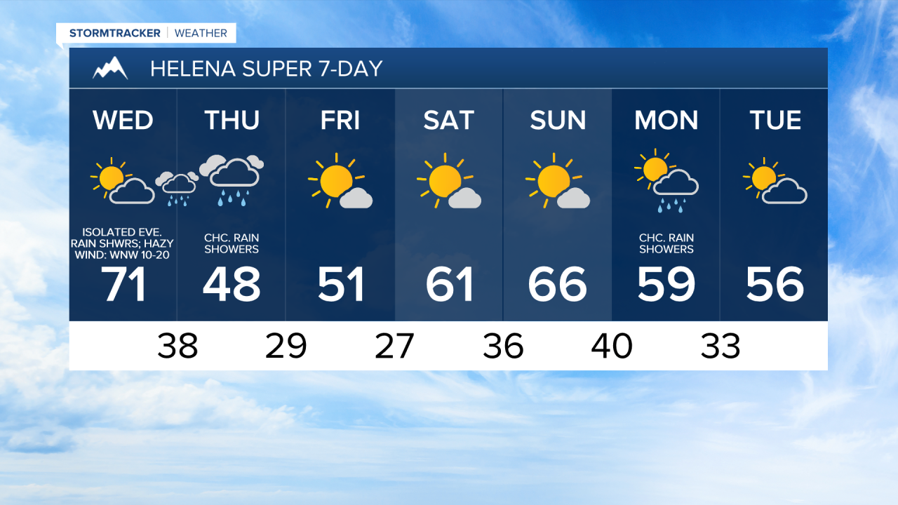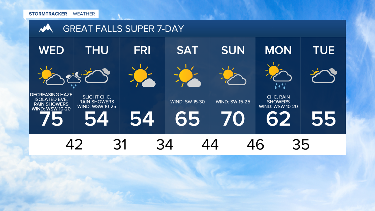 For tomorrow, we are going to have increasing clouds and decreasing haze throughout the day as a cold front begins to approach our area. A few showers are also possible tomorrow evening, generally around and west of I-15. It is also going to be breezy in some areas tomorrow as sustained wind speeds are going to be between 10 and 25 mph, and the wind is going to get stronger as the day goes on. Also, the strongest wind tomorrow is going to be along the Rocky Mountain Front. Tomorrow is also going to be our last warm day of the week as highs are going to be in the 70s and upper 60s in most locations.