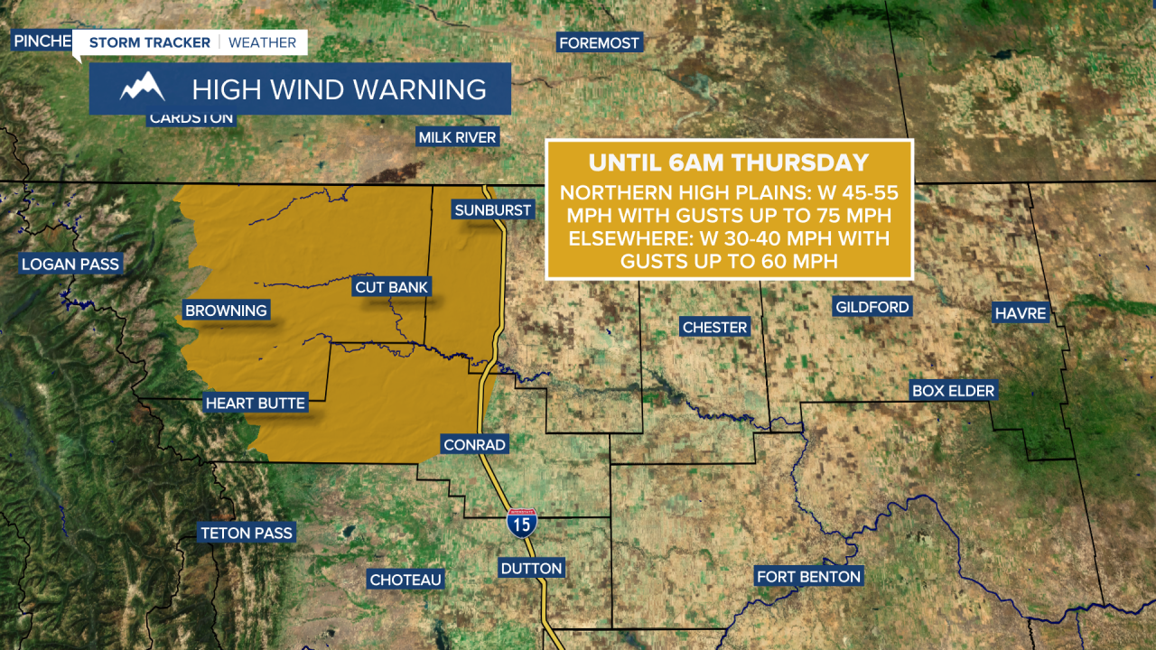 A HIGH WIND WARNING is in effect for central/eastern Glacier County, central Pondera County, and western Toole County until 6am Thursday.