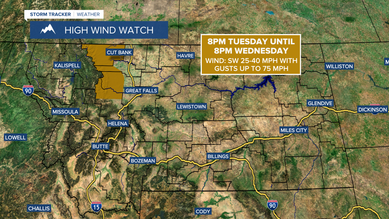 A High Wind Watch is in effect for the Rocky Mountain Front from 8pm Tuesday until 8pm Wednesday. Sustained wind speeds are going to be between 25 and 40 mph, and wind gusts up to 75 mph are going to be possible at times.
