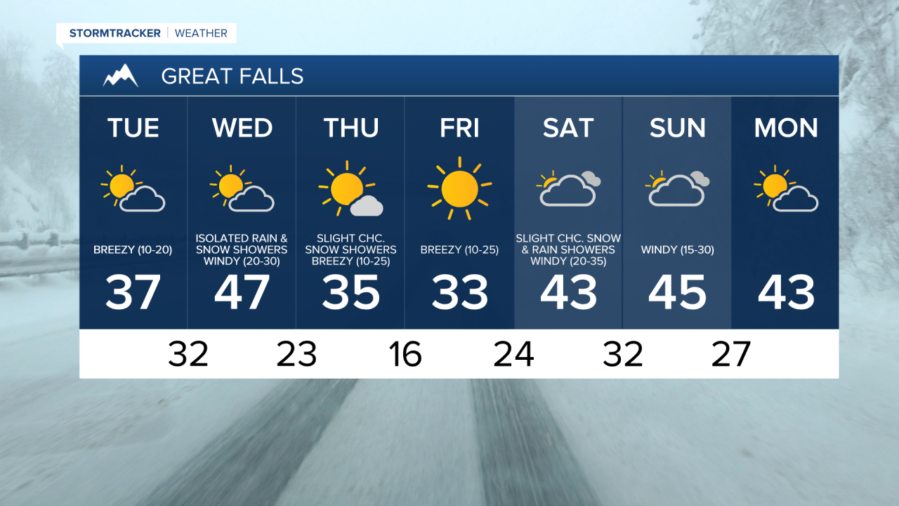 Much colder temperatures are then expected for the end of the work week as highs on Thursday and Friday are only going to be in the upper 20s and low to mid 30s. It is also going to be breezy on these two days, especially in north-central Montana, as sustained wind speeds are going to be between 10 and 25 mph. We are also going to have partly cloudy to mostly sunny skies on these two days with some isolated snow showers around.