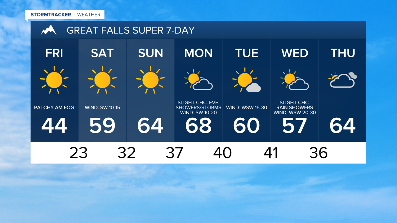 On Monday, we are going to have increasing clouds with a few rain showers and thunderstorms around during the afternoon/evening, especially in the higher terrain around Helena. It is also going to be breezy and mild on Monday as sustained wind speeds are going to be between 10 and 25 mph, and highs are going to be in the 60s and low 70s.