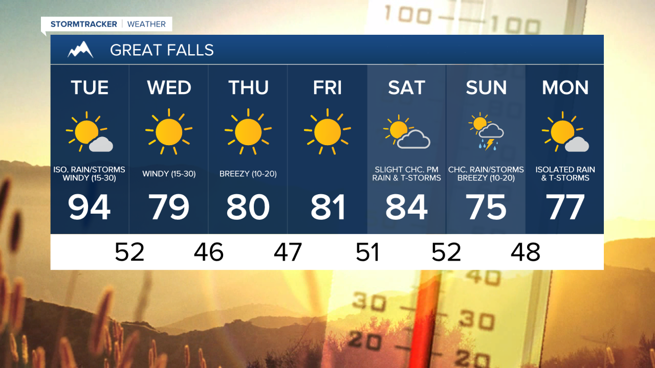 For tonight, there will be partly cloudy to mostly clear skies with a chance of rain showers and thunderstorms as this cold front works its way through. It will continue to be windy tonight as sustained wind speeds are going will be between 15 and 30 mph, and it will be cooler tonight, as lows are will dip into the low to mid 50s in central Montana and the low to mid 60s in eastern Montana.