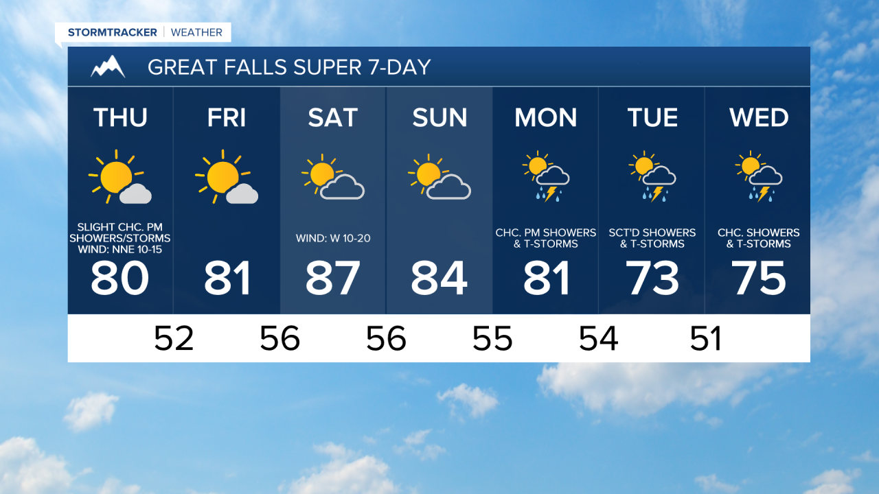 This weekend will be a nice one as we are going to have partly cloudy skies with just some isolated showers and thunderstorms around, generally along the eastern half of the Hi-Line and in the mountains. It is also going to be warm this weekend as highs are going to be in the 80s and mid to upper 70s in most locations. There is also going to be a bit of a breeze around on Saturday as sustained wind speeds are going to be between 10 and 20 mph, and it is going to be a little breezy on Sunday as sustained wind speeds are going to be between 5 and 20 mph.