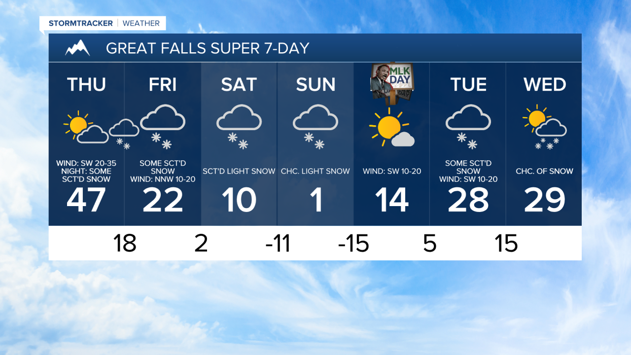 The coldest temperatures since last winter are then expected this weekend as highs are going to be in the -0s, 0s, and low 10s, and lows are going to be in the -0s, -10s, and the -20s. Prepare now for this upcoming cold weather. There will also be more scattered light snow around on Saturday and a few areas of light snow around on Sunday, mainly in western and southern portions of north-central Montana, as an upper-level trough continues to impact our area. We are also going to have partly to mostly cloudy skies on these two days.