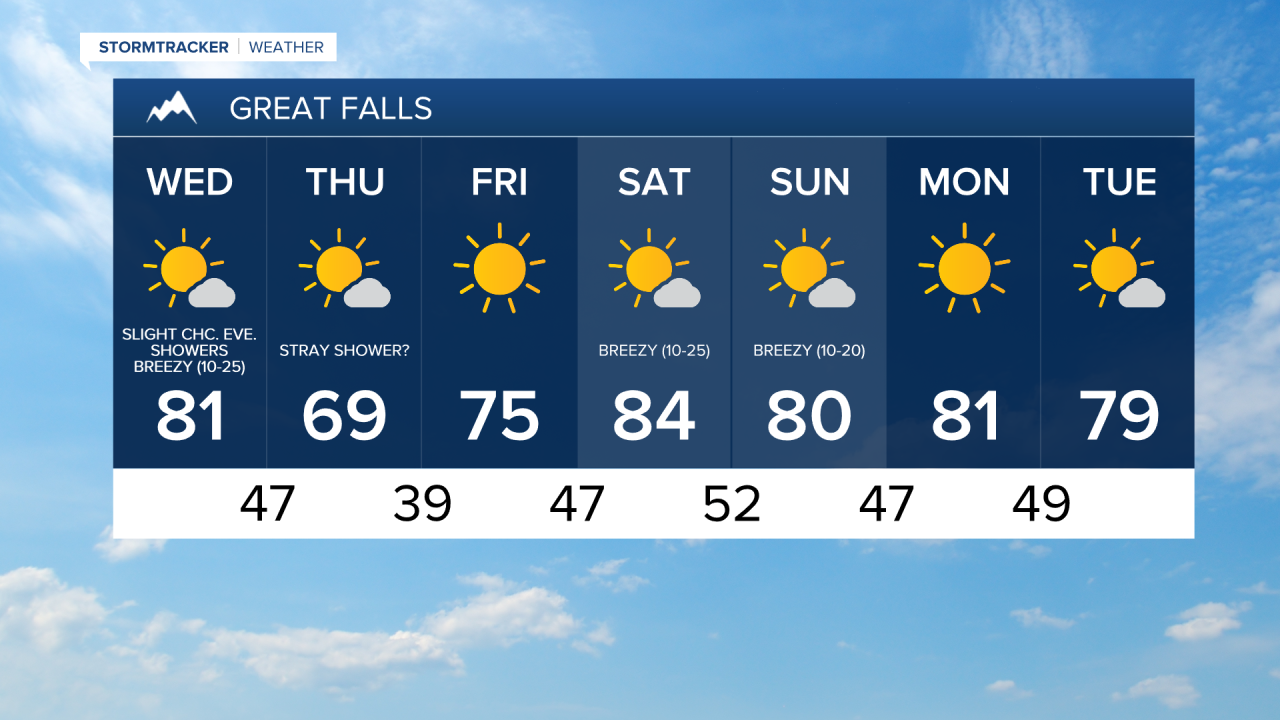 We are then going to have partly cloudy to mostly sunny skies with a slight chance of rain showers on Thursday as this upper-level disturbance departs our area. It is also going to be cooler on Thursday than it is going to be tomorrow as highs are only going to be in the mid to upper 60s and low 70s in most locations. There is also going to be a little bit of a breeze around in central Montana on Thursday as sustained wind speeds are going to be between 10 and 15 mph. In eastern Montana, it is going to be breezy on Thursday, especially during the afternoon and evening, as sustained wind speeds are going to be between 10 and 20 mph.