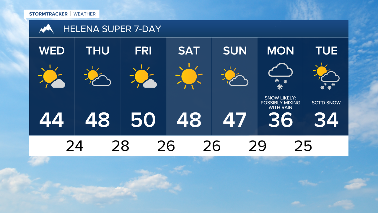 A cold front is then going to cool our temperatures back down for the beginning of next week as highs on Monday and Tuesday are only going to be in the 30s and low 40s. There are also going to be areas of snow and rain around on Monday, and there are going to be some areas of primarily snow around on Tuesday, generally in central Montana, including around Great Falls, Helena, and Lewistown, as a disturbance passes through our area. It is also going to be a bit breezy on Monday as sustained wind speeds are going to be between 10 and 20 mph.