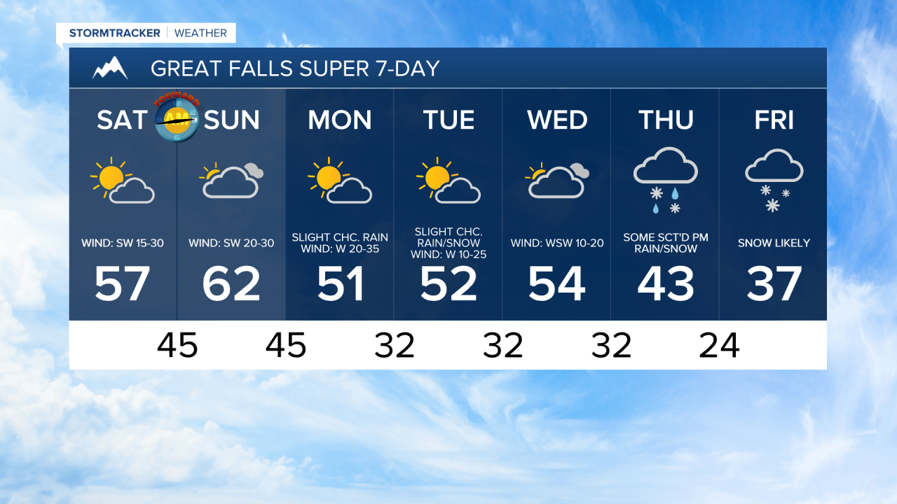 On Monday, a cold front is going to pass through our area so there are going to be a few rain and snow showers around, generally in the mountains and along the Hi-Line, and it will be cooler than it will be this weekend as highs are going to be in the 40s and low 50s in most locations. It is also going to be windy on Monday as sustained wind speeds in a lot of locations are going to be between 15 and 35 mph, and wind gusts up to 60 mph are possible.