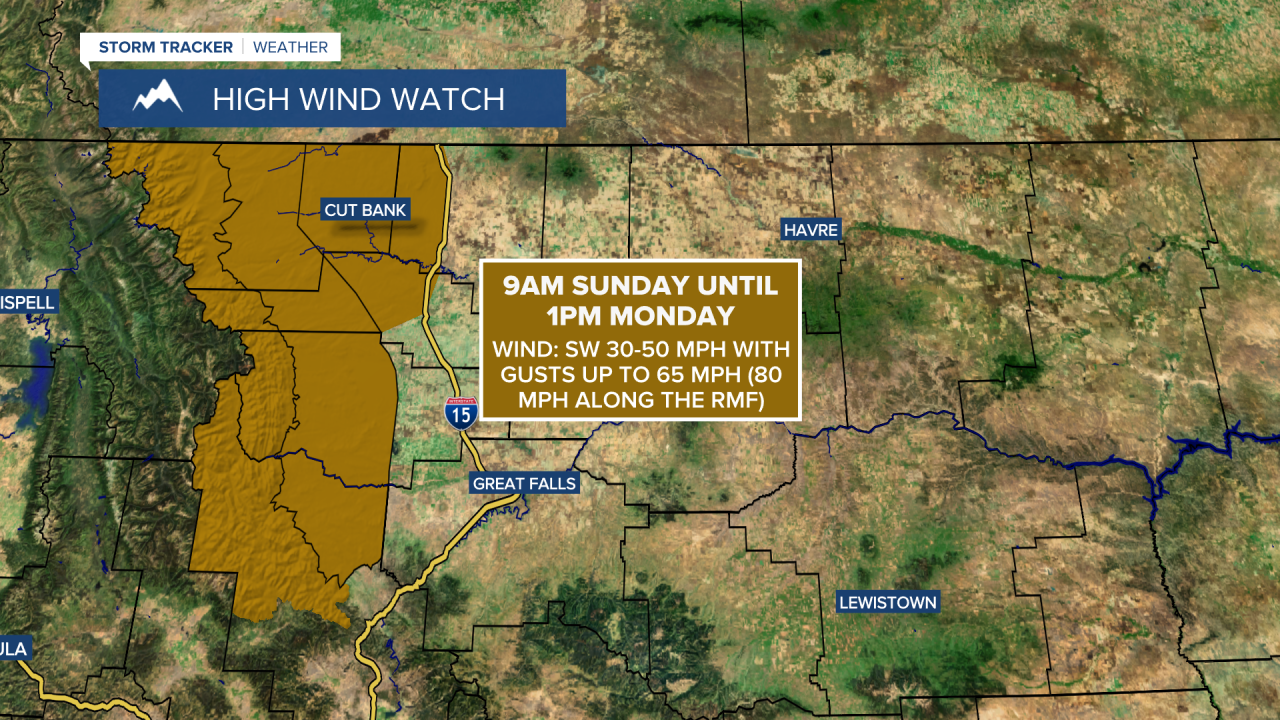 A HIGH WIND WATCH is in effect for the Rocky Mountain Front, the adjacent plains, and the Cut Bank area from 9am Sunday until 1pm Monday.