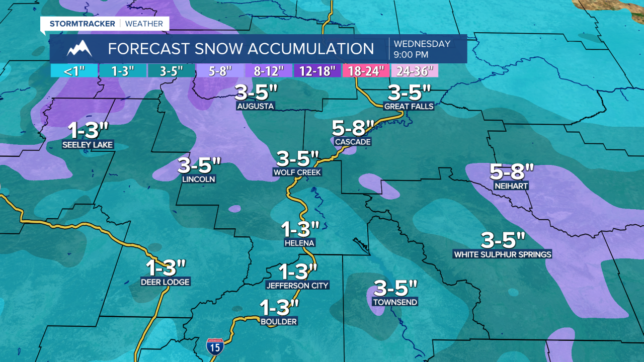 A WINTER WEATHER ADVISORY is in effect for the Glacier National Park area, the Rocky Mountain Front, and portions of central Montana until 5am Wednesday. 1-5" of snow accumulation is expected in the lower elevations, and up to 12" of new snow accumulation is possible in the mountains.