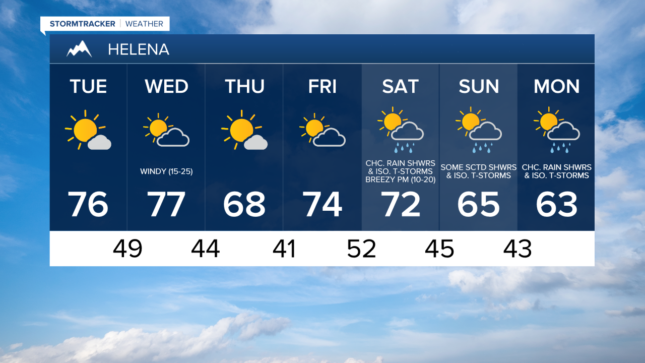 For tomorrow, we are going to have increasing clouds and mainly dry conditions as high pressure is going to be in control of our weather. We are then going to have partly cloudy skies with a slight chance of rain showers and thunderstorms on Wednesday as a cold front passes through our area. The temperatures tomorrow and Wednesday are also going to be near average for this time of year as highs are going to be in the 70s in most locations. There is also going to be a little bit of a breeze around in spots tomorrow as sustained wind speeds are going to be between 5 and 15 mph. It is then going to be windy on Wednesday as sustained wind speeds are going to be between 15 and 30 mph, and wind gusts up to 45 mph are going to be possible in the valleys, while wind gusts up to 60+ mph are going to be possible along the Rocky Mountain Front.