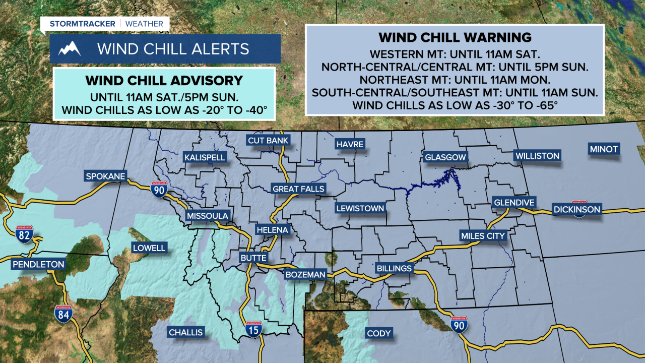 A WIND CHILL WARNING is in effect for western Montana until 11am Saturday; for south-central and southeastern Montana until 11am Sunday; for central and north-central Montana until 5pm Sunday; and for northeastern Montana until 11am Monday. Wind chills as low as -30° to -65° are possible.