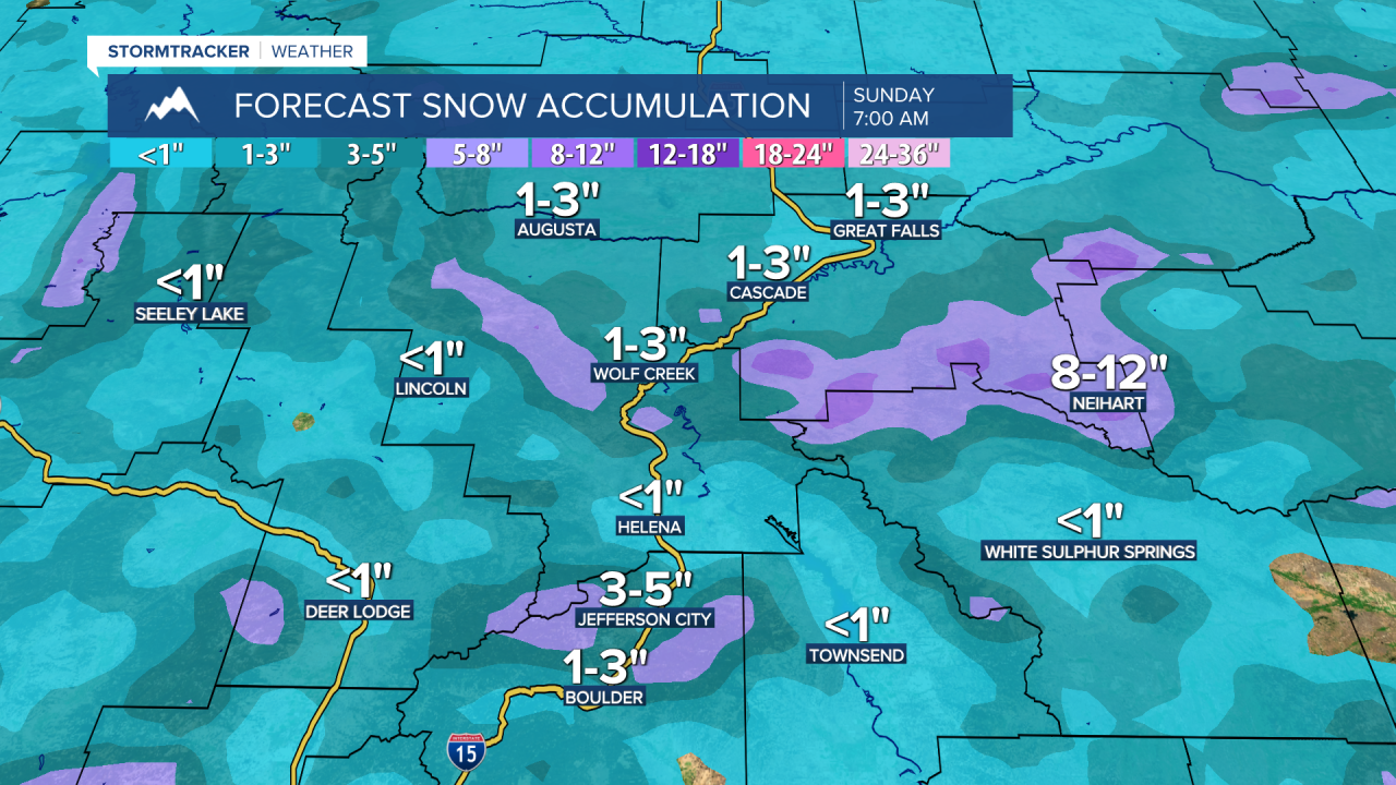 In the lower elevations, less than 3” of snow is expected through Sunday morning in most locations, but along I-15 between Great Falls and Butte (excluding Helena), 1-4” of snow is expected through Sunday morning, and along Highway 87 between Belt and Lewistown, 2-7” of snow is expected through Sunday morning. In the mountains, 4-10+” of snow is expected through Sunday morning, with the highest amounts in the Highwoods, the Judiths, the Little Belts, the Moccasins, and the Snowies. If you are going to be traveling anywhere, be prepared for slippery roads. If you are going to be traveling along Highway 87 between Belt and Lewistown or in the mountains, be prepared for difficult travel conditions at times.