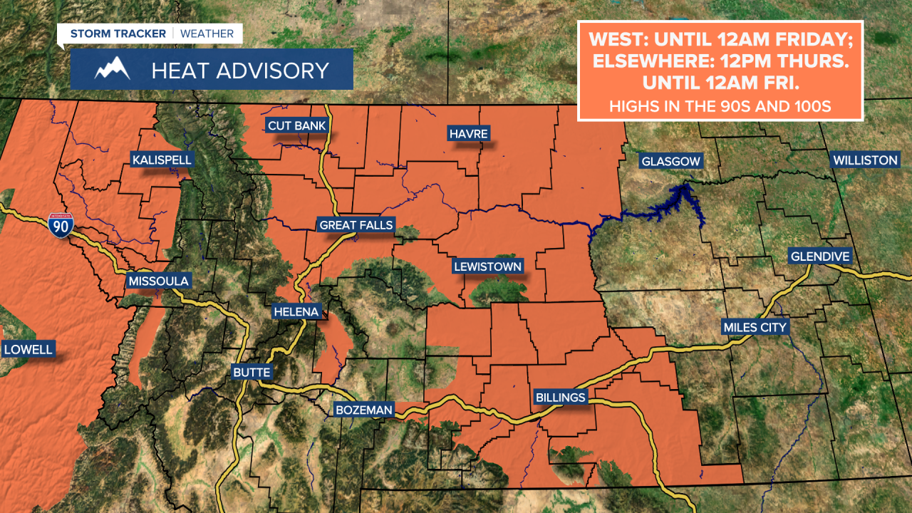 A HEAT ADVISORY is in effect for far western Montana until 12am Friday and for portions of north-central and south-central Montana from 12pm Thursday until 12am Friday. Highs are going to be in the mid to upper 90s and low 100s in most locations.
