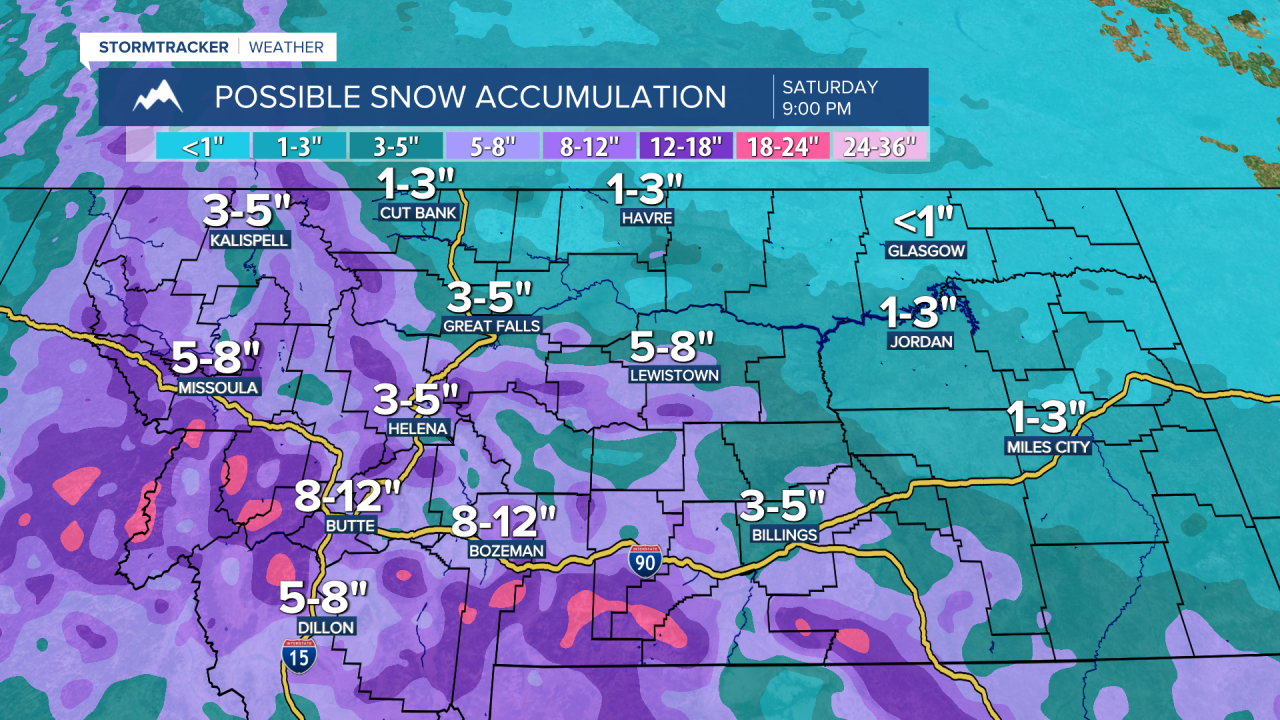 This is going to be an impactful snow event for a lot of western, central, and southern Montana. In these areas (specifically the areas that are under a Winter Storm Warning), 3 to 12 inches of snow accumulation is expected in the lower elevations, and 10 to 24 inches of snow accumulation is expected in the mountains, with isolated locations potentially receiving up to 30” of snow accumulation.