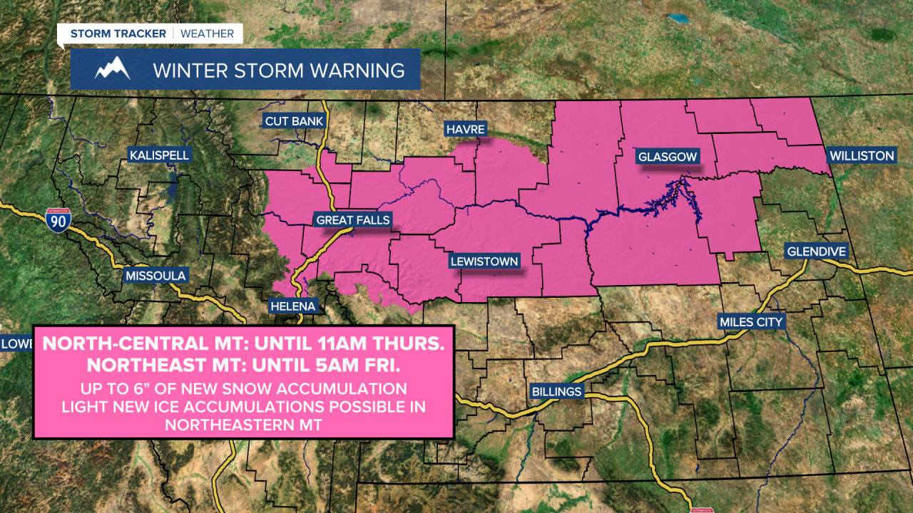 A WINTER STORM WARNING is in effect for portions of north-central Montana until 11am Thursday and for most of northeastern Montana until 5am Friday. Up to 6 inches of new snow accumulation is possible. Light new ice accumulations are also possible in northeastern Montana.