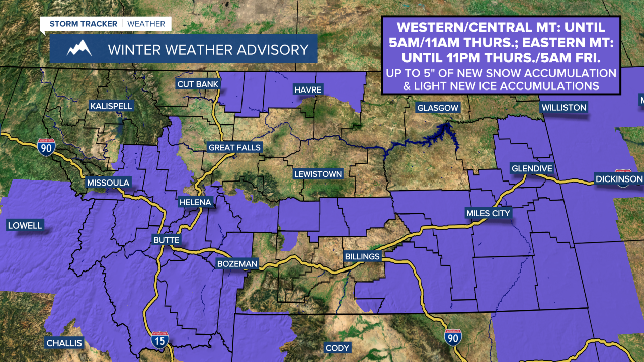 A WINTER WEATHER ADVISORY is in effect for portions of western and central Montana until 5am/11am Thursday and for portions of eastern Montana until 11pm Thursday/5am Friday. Up to 5 inches of new snow accumulation and light new ice accumulations are possible.
