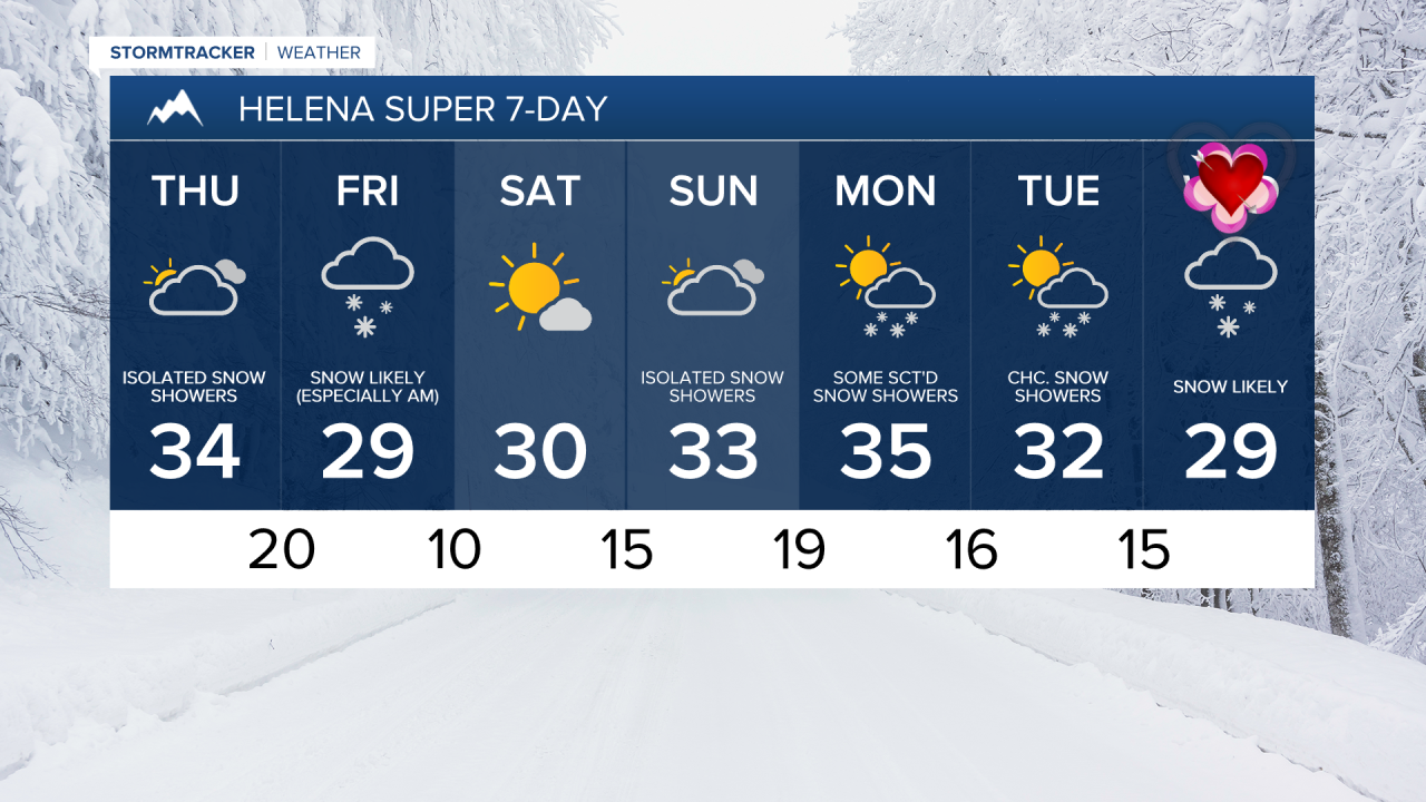 On Monday, there are going to be some scattered snow showers around the Helena area and we are going to have a chance to see some snow and rain showers in north-central Montana, generally in the mountains and along the Hi-Line, as another disturbance passes through our area. A few more scattered snow showers are then possible on Tuesday. We are also going to have partly cloudy skies on these two days. There is also going to be a bit of a breeze around in some areas on these two days as sustained wind speeds are going to be between 10 and 20 mph. Highs on these two days are also going to be in the 30s and upper 20s in most locations.