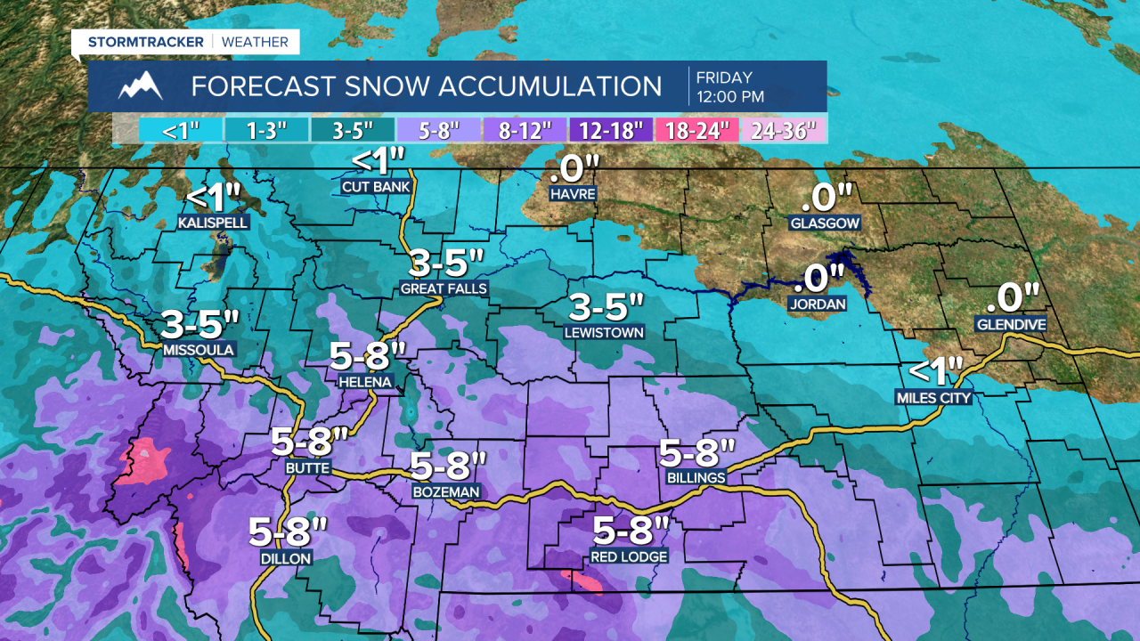 The heaviest snow amounts between this evening and Friday morning are going to be in central and southern Montana. Around the Helena area, 3 to 9 inches of snow accumulation is expected in the lower elevations and 6 to 14 inches of snow accumulation is expected in the mountains. In north-central Montana, the highest snow amounts through Friday morning are going to be along the Rocky Mountain Front and out to I-15 as well as in Cascade, Fergus, and Judith Basin counties, where 1 to 6 inches of snow accumulation is expected in the lower elevations and 5 to 10 inches of snow accumulation is expected in the mountains. Along the Hi-Line east of I-15, less than an inch of snow accumulation is expected for those that do see snow.