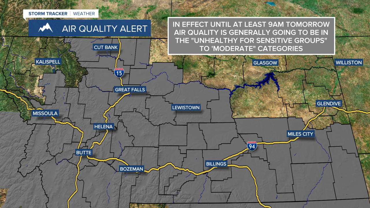 Due to wildfires burning locally, and due to wildfires burning in other states throughout the western U.S., smoky and/or hazy skies are expected for the foreseeable future here in Montana. With this smoke in the air, the air quality is likely going to continue to be in the “moderate” or “unhealthy for sensitive groups” categories for the foreseeable future, so if you are sensitive to increased particulates in the atmosphere, then you may want to try and limit your time outdoors. There is also an Air Quality Alert in effect until at least 9am tomorrow morning for a decent chunk of Montana due to this poor air quality.
