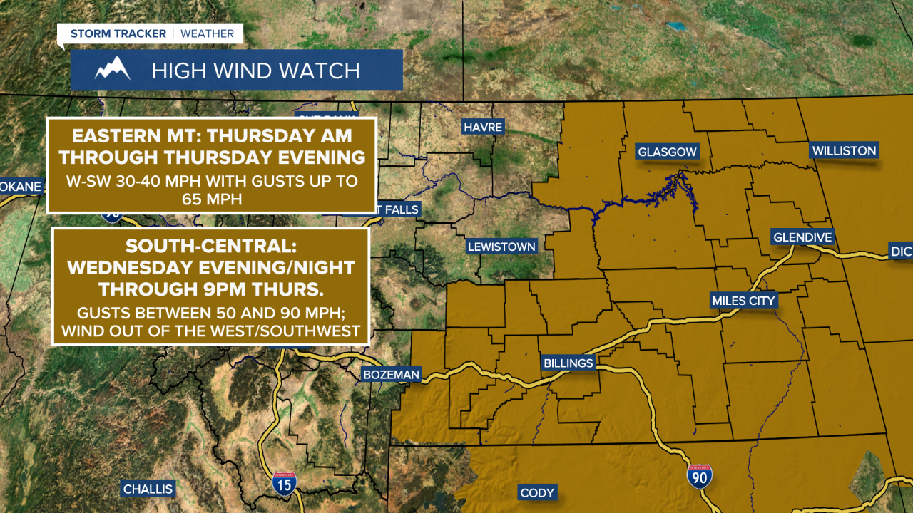 East of the Rocky Mountain Front in north-central Montana and around the Helena area, sustained wind speeds are going to be between 25 and 50 mph, and gusts between 65 and 85 mph are possible. A HIGH WIND WARNING is in effect for this area from 12am/3am until 6pm Thursday. There is also a HIGH WIND WATCH in effect for northeastern Montana from Thursday morning through Thursday evening as gusts up to 65 mph are possible.
