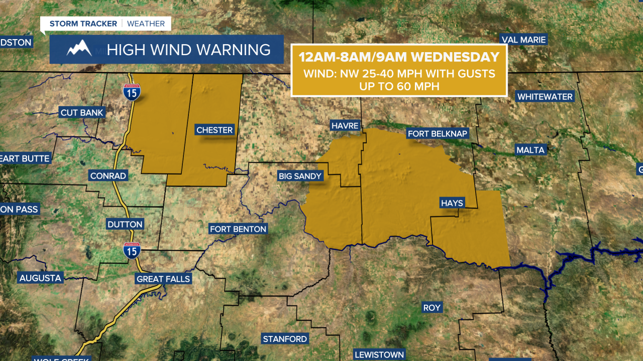 Around and west of I-15, there will be a bit of a breeze around tonight, generally before midnight, as sustained wind speeds are going to be between 10 and 20 mph. East of I-15, gusty winds are expected tonight as sustained wind speeds are going to be between 10 and 30 mph, and wind gusts up to 50 mph are possible. A HIGH WIND WARNING is in effect for the Bears Paw mountains, eastern Toole County, Liberty County, and southwestern Phillips County from 12am until 8am Wednesday as gusts up to 60 mph are possible in these locations. The strongest wind tonight will occur with the passage of the front. It is also going to be cold tonight as lows are going to be in the teens and low 20s, with wind chills in the 0s and -0s.