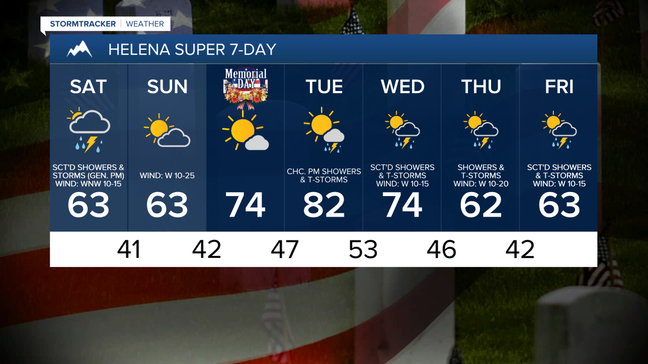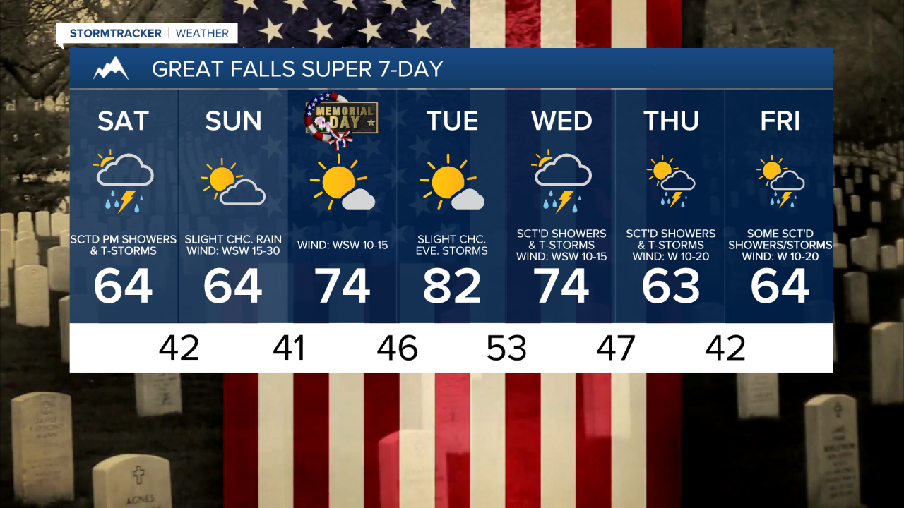 Tomorrow is going to be the wettest day of the holiday weekend as there are going to be scattered showers and thunderstorms around, generally during the afternoon and evening, as a disturbance passes through our area. We are also going to have partly to mostly cloudy skies and pleasant temperatures tomorrow as highs are going to be in the 60s and mid to upper 50s. It is also going to be breezy tomorrow along and just east of the Rocky Mountain Front as sustained wind speeds are going to be between 10 and 25 mph.