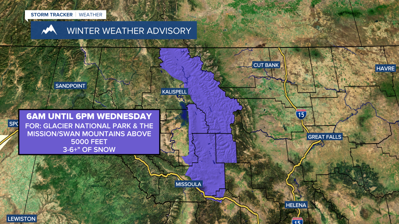 A WINTER WEATHER ADVISORY is in effect for Glacier National Park and the Mission and Swan Mountains above 5000 feet from 6am until 6pm Wednesday.