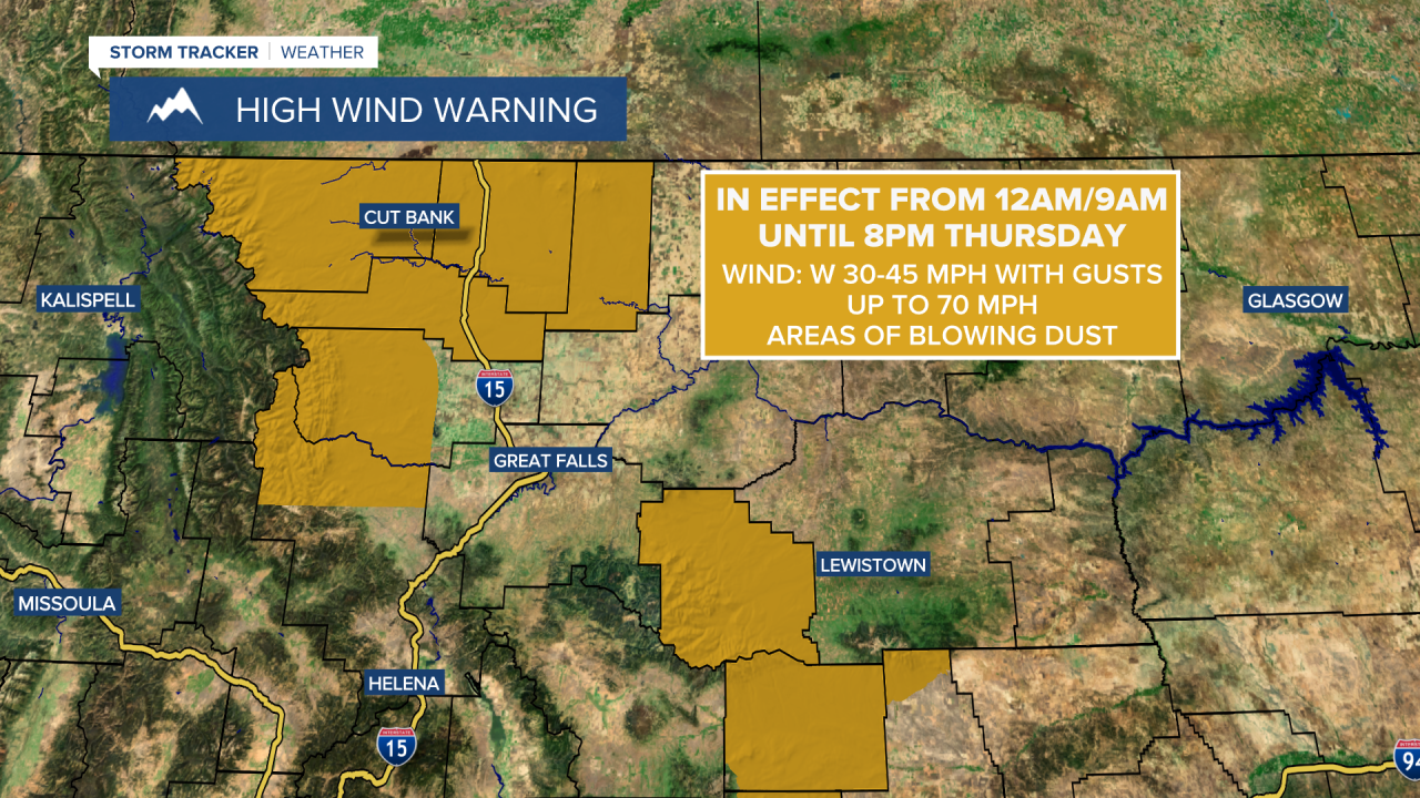 A High Wind Warning is in effect for Glacier County, Judith Basin County, northwestern Lewis and Clark County, Liberty County, Pondera County, western Teton County, and Toole County from 12am or 9am Thursday until 8pm Thursday. Sustained wind speeds are going to be between 30 and 45 mph, and wind gusts up to 70 mph are going to be possible at times.
